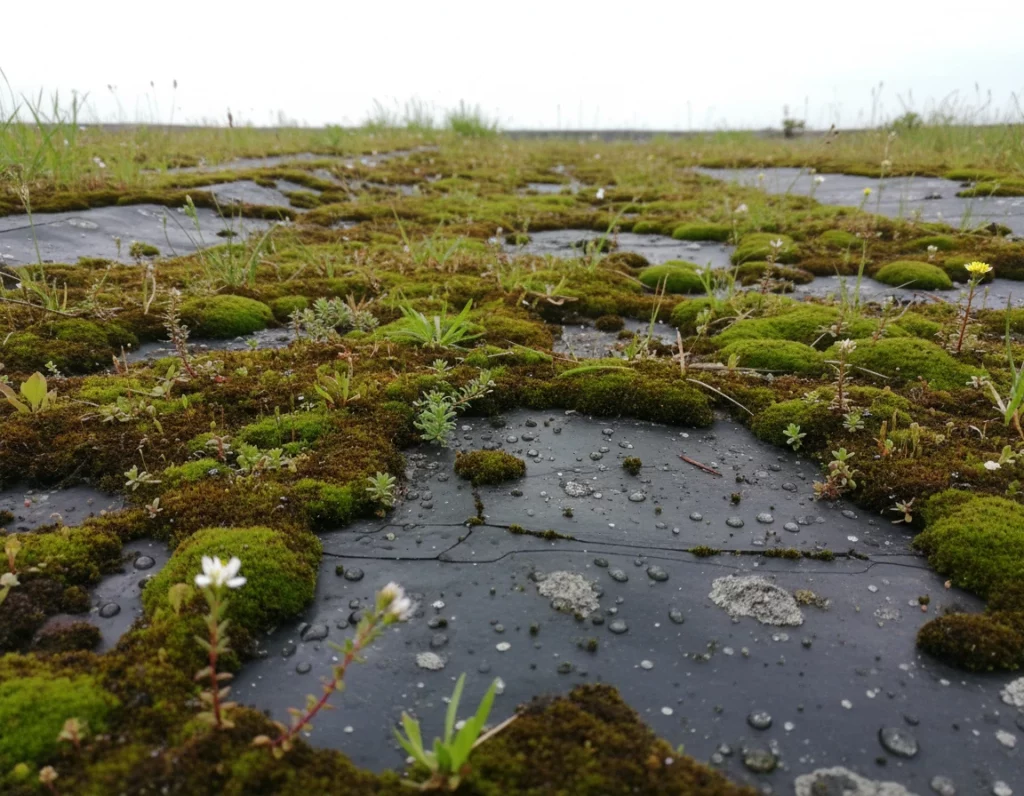 Les dépôts de terre et de poussière favorisent également le développement de végétation. Une fine couche suffit pour que des graines germent et que des plantes s’installent. Sur les toitures plates peu pentues, ce phénomène s’observe fréquemment et nécessite un entretien régulier.